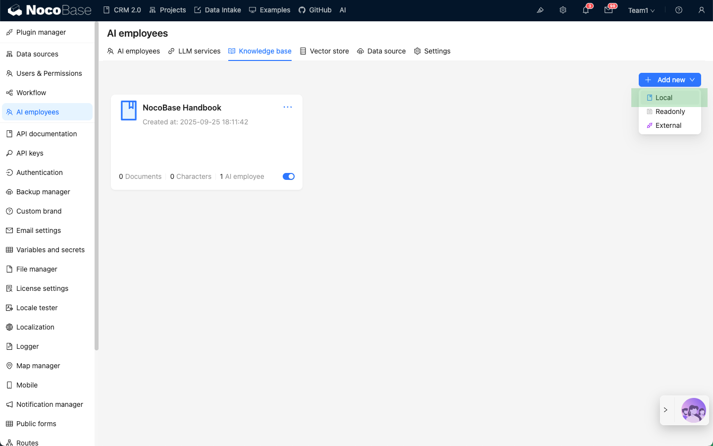 Nhấp vào nút Add new ở góc trên bên phải để thêm cơ sở tri thức Local.
