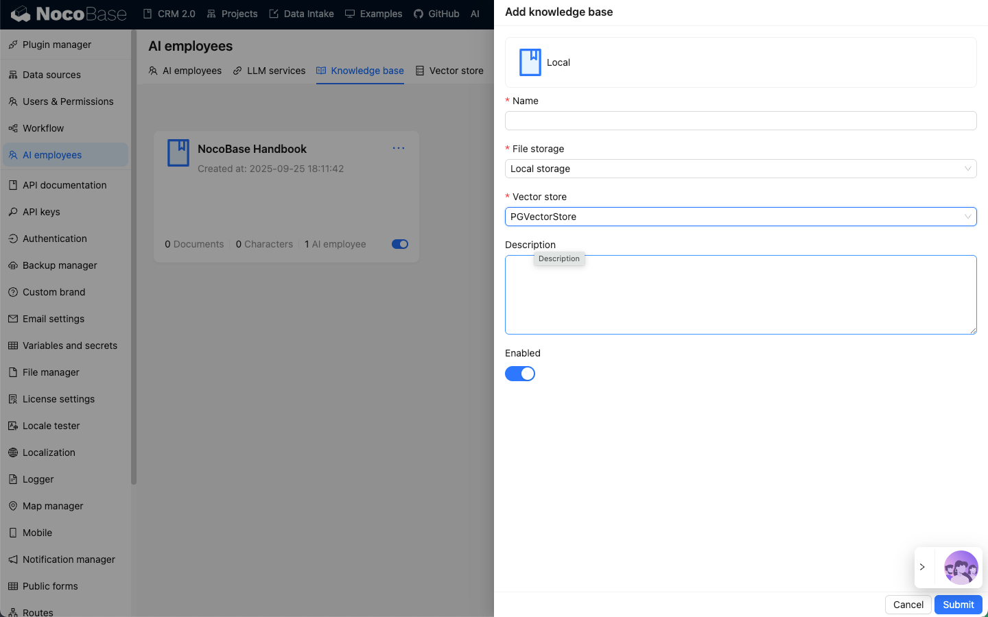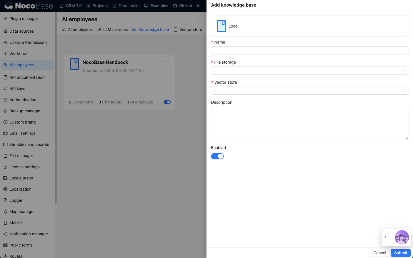 Cơ sở tri thức Local là loại cơ sở tri thức được lưu trữ cục bộ trong NocoBase. Các tài liệu và dữ liệu vector của chúng đều được NocoBase lưu trữ cục bộ.