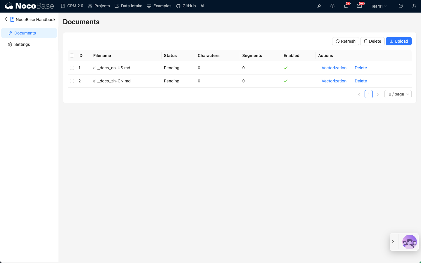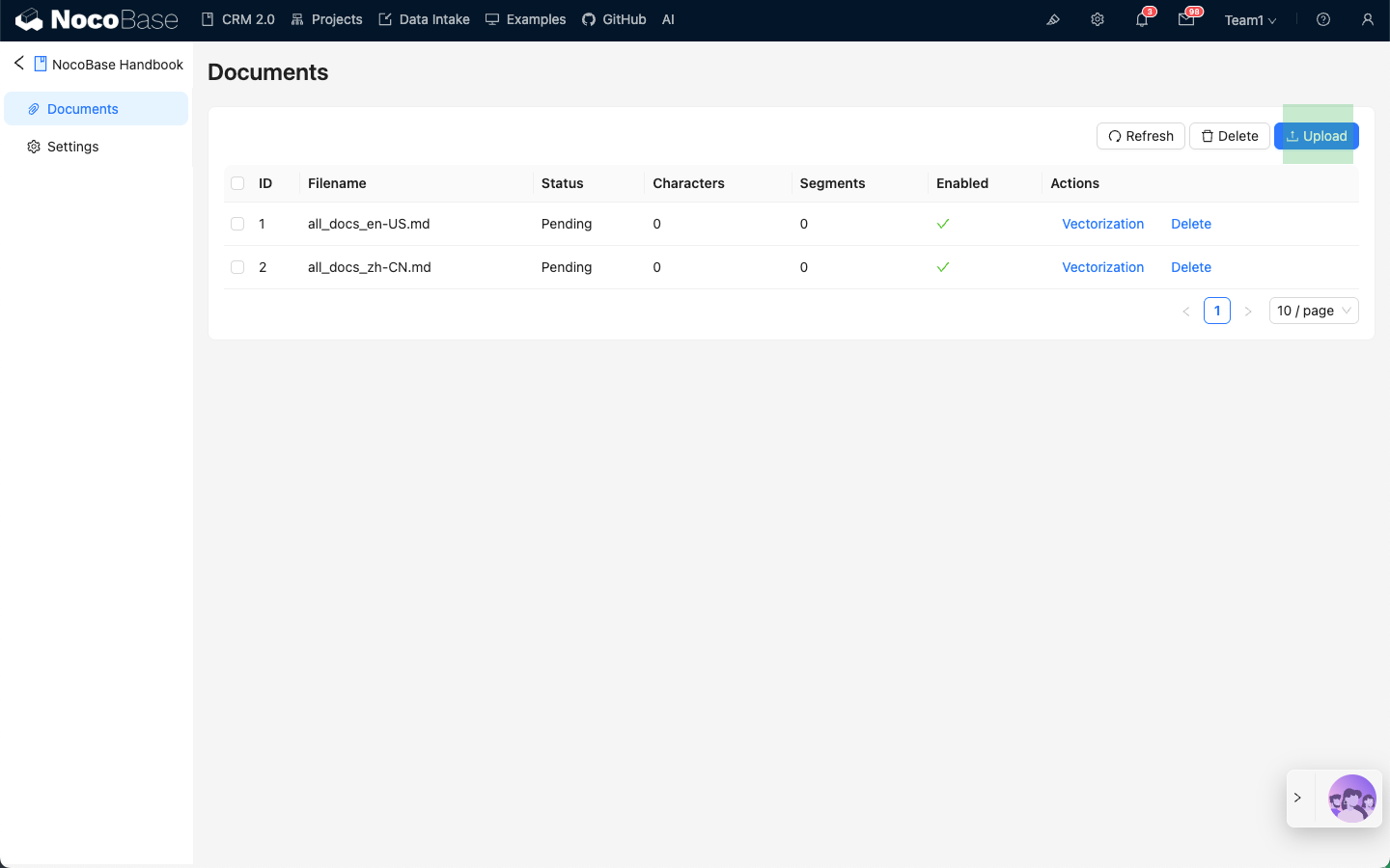 Nhấp vào nút Upload để tải tài liệu lên. Sau khi tài liệu được tải lên, quá trình vector hóa sẽ tự động bắt đầu. Vui lòng đợi Status (Trạng thái) chuyển từ Pending (Đang chờ) sang Success (Thành công).