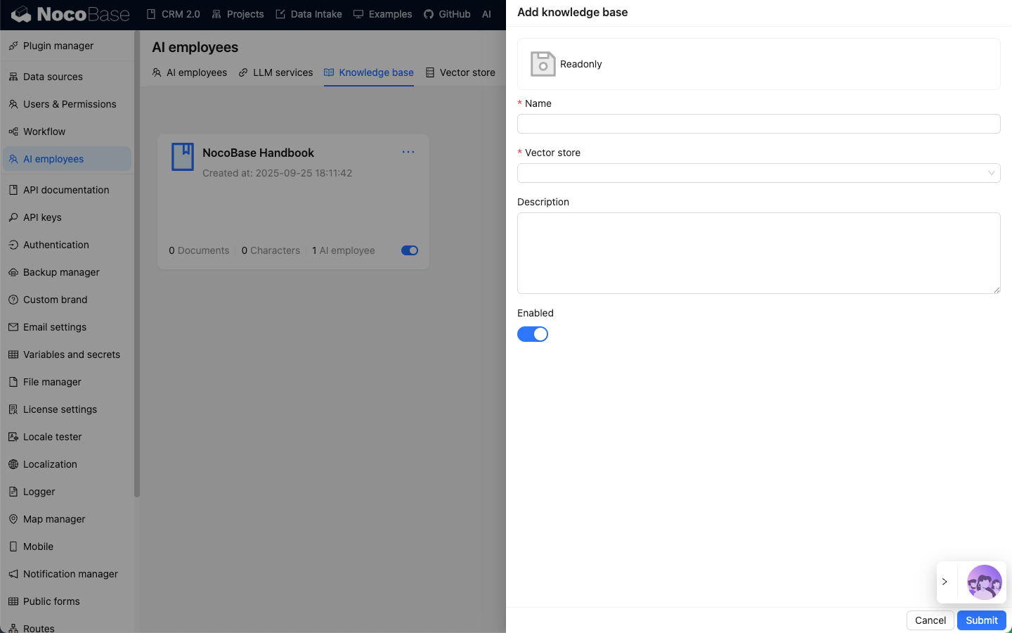 Cơ sở tri thức Readonly là cơ sở tri thức chỉ đọc. Các tài liệu và dữ liệu vector được duy trì bên ngoài. NocoBase chỉ tạo kết nối đến cơ sở dữ liệu vector (hiện tại chỉ hỗ trợ PGVector).