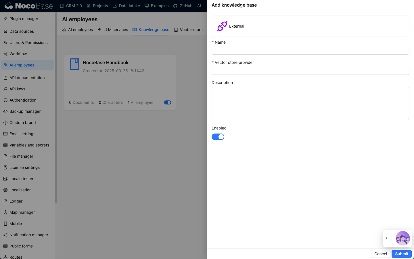 Cơ sở tri thức External là cơ sở tri thức bên ngoài, nơi các tài liệu và dữ liệu vector được duy trì bên ngoài. Việc truy xuất cơ sở dữ liệu vector cần được các nhà phát triển mở rộng, cho phép sử dụng các cơ sở dữ liệu vector hiện không được NocoBase hỗ trợ.